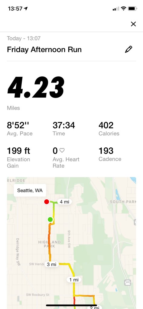 A bit of back-story. I’ve been running 3-4 days a week, every damn week since March 1st. I’d planned to start exercising more pre-corona, but didn’t think it would become as important to me as it has. The last time I ran this regularly, I was 29 years old and training for my marathon, and that training lasted about 20 weeks. After I finished that 26 mile run, I was DONE. Honestly, I did one short “let’s see if I can squeeze an ounce joy from this activity anymore!” run after my marathon, and then nothing else. No running at all. There’s a solid 3 year gap between recorded runs on my Nike app – I WAS OVER IT.